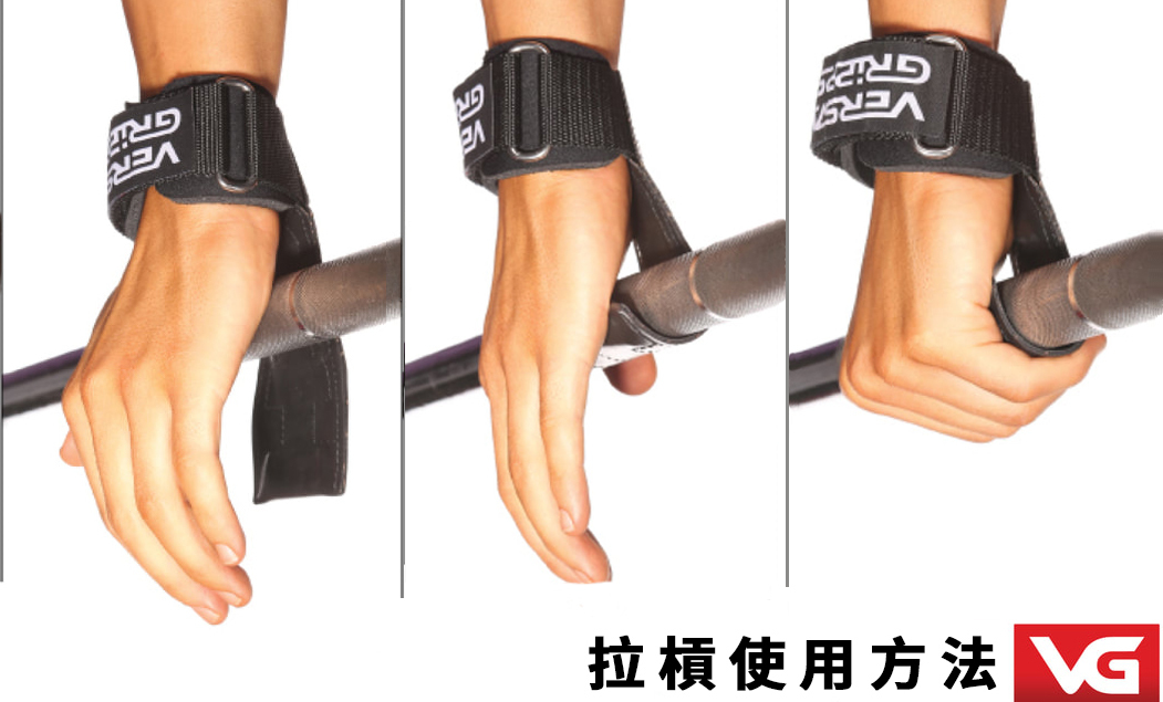 Versa Gripps在進行拉槓運動,例如硬舉,划船或引體向上時,可以安全且不緊勒手腕,減少手部疲勞,增加訓練時的感受度。將Versa Gripps置於掌前,把槓放在掌心和Versa Gripp專利掌墊之間後使用指尖,將專利掌墊較厚端捲入掌心,將其包覆在槓和手掌之間後便能開始進行拉槓訓練。Versa Gripps在專利掌墊內置一個拱形襯墊,能夠有效支撐手掌的拱形結構,為手掌提供人體工學支撐,有效避免的腕隧道因訓練受到傷害。
