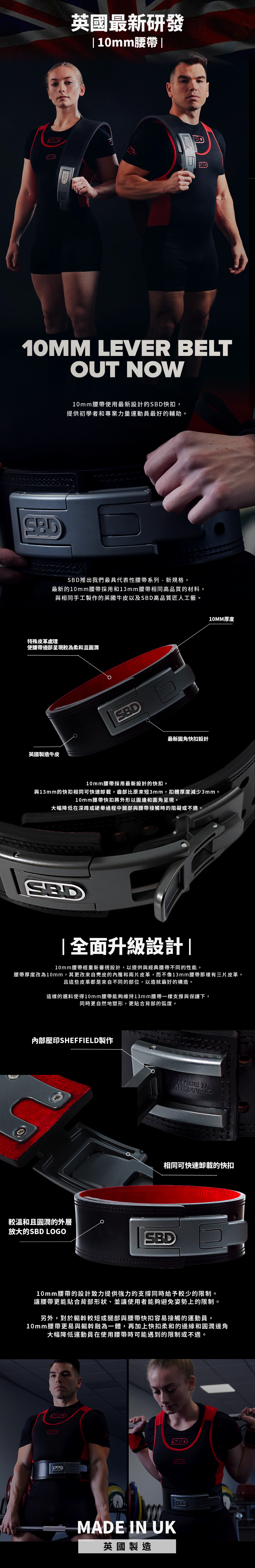 SBD全新經典10mm健力腰帶,英國手工製作,Made In UK。全面更新SBD LOGO壓印在黑色皮革表面和專利快扣,搭配強化處理紅色麂皮內裏,不怕流汗掉色,更耐用。